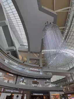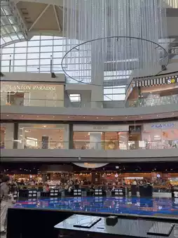 Overlooking the foodcourt is the breathtaking Marina Bay Sands chandelier, an impressive art installation made up of thousands of hand-blown glass pieces. Its intricate design and sparkling presence add a touch of elegance and magic to the dining atmosphere, making your meal feel extra special.