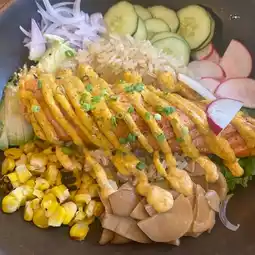 They have an amazing selection of drinks, both alcoholic and non-alcoholic, perfectly paired with delicious dishes. Perfect grilled salmon with the sauce. The vibe is super cozy, and the greenery makes it a perfect spot to chill.