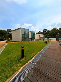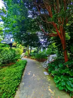At the main entrance, the vibes are more of a naturalistic resort vibes, with plantations and stone walkways. But it's actually a multi-purpose building with eateries and open areas for events.