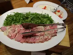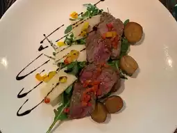 The antipasti spread was generous and high-quality—a fine selection of cheeses, cold cuts, fresh greens, breads, and a dessert table that tempted us before the main even arrived. But we couldn’t resist the Wagyu beef main, which turned out to be perfectly done medium rare and melt-in-the-mouth delicious.