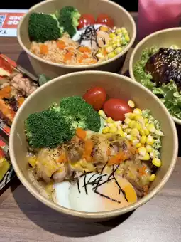 For those who prefer rice, this donburi features tender teriyaki-glazed chicken leg with a spicy sambal kick, fresh greens, cherry tomatoes, pickles, and a balancing onsen egg.