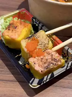 Don’t miss the sides! Choose from yakitori grilled chicken skewers slathered with Mentai, Mala Mentai, or Garlic Mayo sauces, and fluffy flame-torched rolled omelette skewers with matching sauces.
