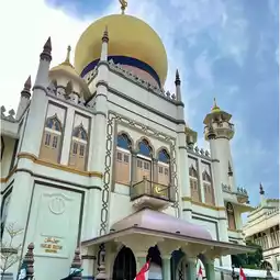 The "Sultan Mosque" is especially breathtaking, with its golden dome standing out against the blue sky, making it a very popular photo spot 🌟
