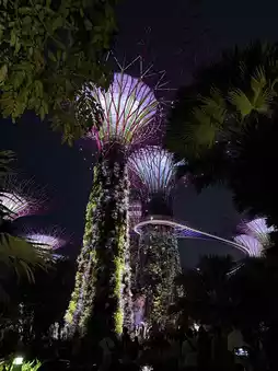 Gardens by the Bay Singapore! When visiting Singapore, you absolutely cannot miss going to Gardens by the Bay. It is a large public park that beautifully combines nature with technology. The main highlight you must see is the Supertrees Grove, a group of giant artificial trees standing 25-50 meters tall. They are not only impressive in appearance but also serve as vertical gardens housing a variety of plant species. At night, there is a spectacular Garden Rhapsody light and sound show that feels like stepping into a fairy tale world. Additionally, there are two giant glass domes you must visit: the Cloud Forest, which feels like a simulated forest with the world's tallest indoor waterfall, and the Flower Dome, where you can stroll among various plants from around the world in a cool, relaxing atmosphere. Personally, I went both during the day and at night to capture the full experience. I can confidently say that if you go to Singapore, you must visit Gardens by the Bay.