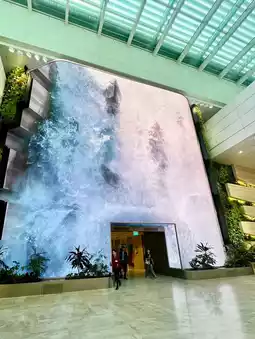 After my meal, I walked to The Wonderfall, a new highlight of Terminal 2 that transforms the passenger hall into an oasis in the middle of the airport. The continuous water falling and the lights create a magnificent atmosphere, making it a "people's corner" that everyone must capture as a memory.