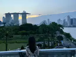 As the sun began to set, the sky turned a deep pink-orange. The silhouettes of the tall buildings at Marina Bay Sands and the Singapore Flyer slowly traced the horizon. The scene was so beautiful, I paused for a moment. Many families and couples took out their cameras to capture this moment, just like me, capturing the sunset here as a memory.