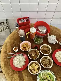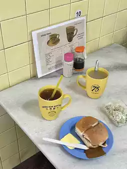 Later, we stopped by a Chinese-style tea restaurant 🍵 with the cutest yellow cups 💛. I ordered iced tea 🧊, barley water, and a kaya bun 🥯—the staff there were super sweet.
