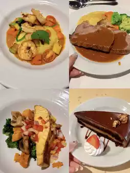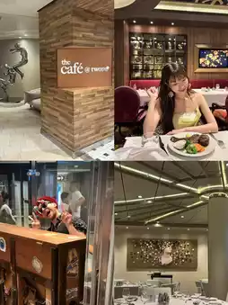 • Dinner 🍖: Recommend the main dining halls and Solarium Bistro. There are 4 main restaurants (The Grande, Chic, Silk, American Icon), with identical dishes but different atmospheres. Menus change daily, always including steak and shrimp. Solarium Bistro is more refined (reservation required).