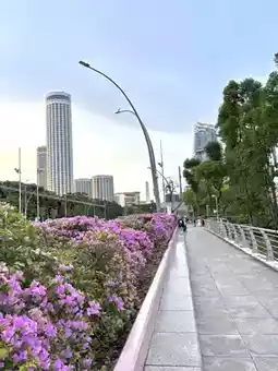 ✨ Tip: Sunsets in the evenings are especially beautiful, especially when photographed with flowers. At night, the bridge is illuminated in golden colors, creating a truly romantic scene. We recommend shooting back towards Marina Bay Sands to capture the buildings, their reflections on the water, and the luxurious atmosphere in one shot.