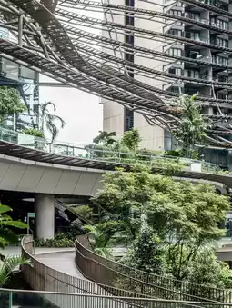 Designed by the international architectural firm Ingenhoven Architects, the twin tower complex features a three-story botanical garden, the "Green Heart," featuring over 400 plant species and waterfalls, creating a tropical rainforest ecosystem within the city.