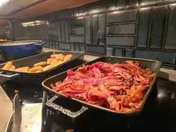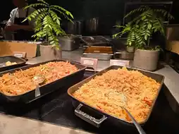 The buffet line is huge, offering Singaporean dishes (such as rice porridge, grilled chicken, and stir-fried noodles), Western dishes (eggs, bacon, and a variety of breads), and a healthy food corner (yogurt, fresh fruit smoothies).