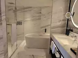 The Hilton Signature Bed is perfectly soft, providing a comfortable night's sleep. The marble bathroom features a separate bathtub and shower, complete with premium amenities.