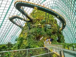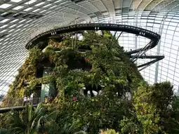 The Cloud Forest Dome, located within Gardens by the Bay, is an indoor garden centered around a massive man-made waterfall and a moss-covered mountain. Reproducing the climate of a tropical alpine region, the Dome maintains a cool temperature. The space, bathed in a mixture of water vapor and light, creates the feeling of walking through a "garden in the sky." Sunlight streaming through the glass dome ceiling reflects off the water droplets, creating a mystical atmosphere.