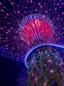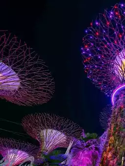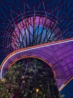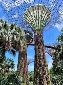 Supertree Grove at Gardens by the Bay is the kind of place that humbles you a little towering metal “trees” draped in greenery, set against the Singapore skyline, both wild and engineered. By day they shade you and offer dramatic silhouettes; by night they glow in unison in the Garden Rhapsody light and sound show, transforming the grove into a living canvas of color and music.