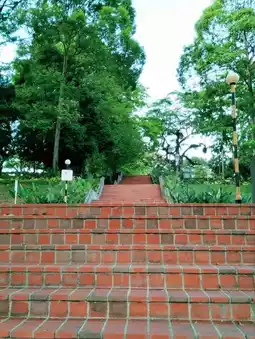 From another perspective, the red brick steps stretch upward, flanked by lush greenery, with dazzling light at the end resembling a staircase to heaven. Nestled within the bustling city, this view, with its unique play of light and shadows and striking lines, has become an astonishingly popular photo spot.