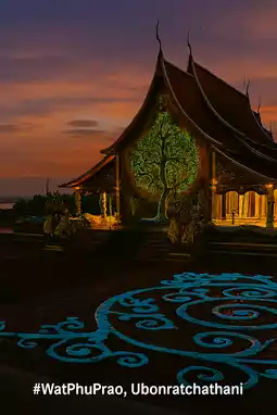 Located on a hill in Sirindhorn District, this temple stands out for its ubosot (ordination hall) decorated with "glowing trees." The green patterns illuminate at night, creating a world of fantasy. The contrasting blue glow pattern gracefully draped over the stone terraces—every step is a simultaneous experience of art and devotion.