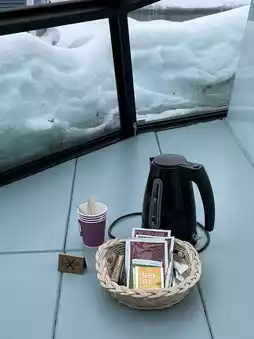 Our room was a glass igloo with two separate beds. Inside, there was a basic sink and toilet, but for showers, you need to head to a designated wooden cabin outside.