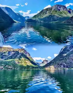 From the bow of the boat, I saw many small mountain towns dotted along the banks of the deep fjord, nestled against the backdrop of majestic peaks. It was a truly beautiful sight. I was lucky enough to have clear skies that day, and the blue sky, white clouds, and mountain peaks reflected in the water were even more captivating.