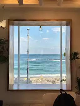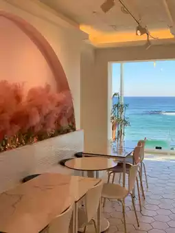 The cafe offers stunning ocean views through its large windows, with waves and the harbor visible directly from the tables. Pets are allowed if they are in bags or carriers, and you can even sit indoors with them.