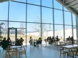 Wooden tables and chairs, plants placed throughout β Eco-friendly vibe