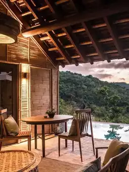 The hotel has a total of 73 villas, scattered on the mountaintop, in the valley, and by the beach, offering stunning panoramic views of the sea or hills. The architecture silently blends into the natural environment, with roofs almost invisible above the treetops.