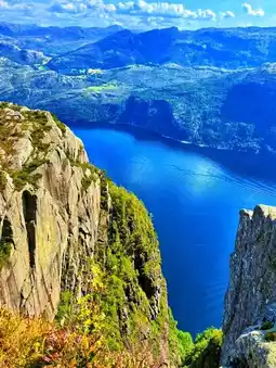 One of the most unforgettable experiences in Norway is hiking to Preikestolen (Pulpit Rock), the world-famous cliff towering 604 meters above Lysefjord. Standing at the edge of this flat plateau and looking down at the fjord below was both thrilling and humbling—it truly felt like nature’s grand stage.