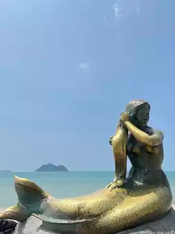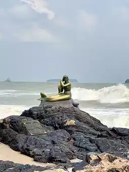 Samila Beach, located in Hat Yai along the southern Gulf of Thailand, is a popular destination for locals from Hat Yai and Songkhla, as well as tourists from Thailand, Malaysia, and Singapore. The beach offers a serene atmosphere, especially in the evenings. On sunny days, the contrast between the sky and the sea creates a stunning view. Along the roadside, vendors sell various items, and one must-try is the young coconut ice cream. There are plenty of food options available, and nearby restaurants allow visitors to buy meals and enjoy them on the beach while relaxing on a mat and taking in the scenery.