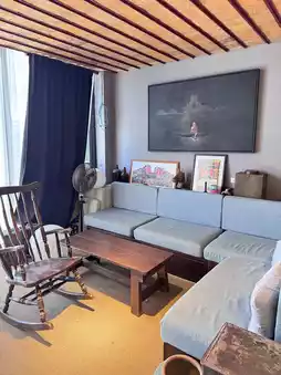 ✨ A warm, minimalist cafe with a simple, soothing atmosphere, like relaxing in an art studio.