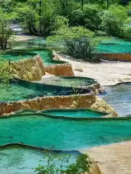 Huanglong: Situated at the southern foot of the Min Mountains in Songpan County, Aba Prefecture, it is China's only well-preserved highland wetland. The surface travertine formations in the scenic area are its distinctive geological feature, formed over thousands of years, resembling a yellow "giant dragon" lying in the snow-capped mountain valley, hence the name Huanglong.