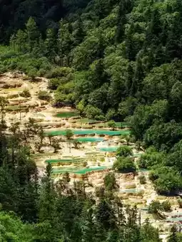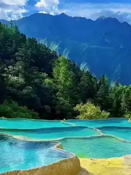 Huanglong: Renowned for its "Four Wonders" of colorful pools, snow-capped mountains, valleys, and forests, later expanded to include "Seven Wonders" with the addition of shoals, ancient temples, and folk customs. The main scenic area, Huanglong Valley, features over 3,400 travertine pools, the largest and best-preserved group of its kind in the world. Viewed from above, it resembles a golden dragon winding through the lush valley. The Five-Color Pond is the highlight of Huanglong, with pools of varying sizes and shapes that shimmer in shades of light blue, milky white, sea blue, goose yellow, and emerald green under sunlight, creating a magical spectacle.