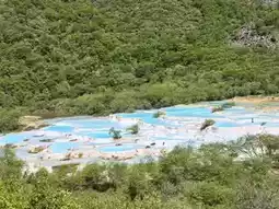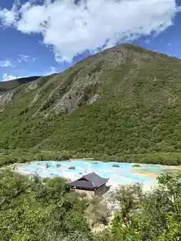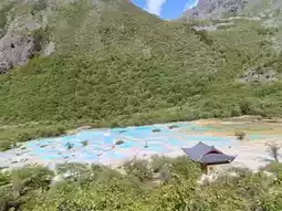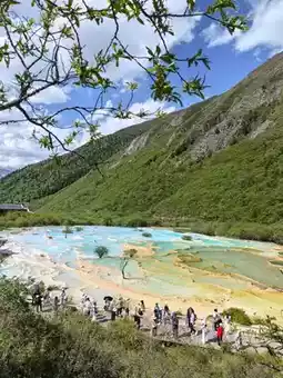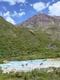 As altitude sickness slowly set in—dizziness, headache, and a racing heart—we rested briefly at the service center before continuing. At around 3,500 meters above sea level, the Five-Color Pools finally came into view. These tiered pools and cascading waterfalls, resembling terraced fields, varied in shape: some like lotus flowers, others like lotus leaves. Due to the interplay of sunlight with the whitish travertine and algae on the lakebeds, the pools shimmered in a dazzling array of colors. The clear weather made it the perfect time to admire them. Though fed by the same source, each pool displayed unique hues, a testament to nature's artistry in sculpting this "Jade Pool on Earth."