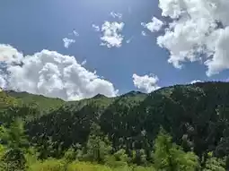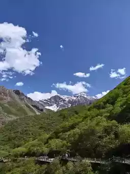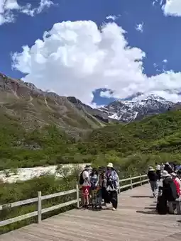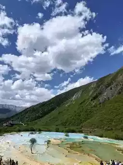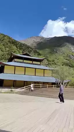 Today, our group set off for Huanglong Scenic Area. Unable to endure the 8-hour bumpy bus ride, we opted for the high-speed train and, by chance, experienced first-class seats for the first time. Upon arrival, we learned that the bus group was stranded midway due to flood-damaged roads. We decided to proceed to Huanglong first. After taking the cable car, we ascended along the wooden walkway, strolling under blue skies and white clouds, through dense forests, listening to babbling streams and birdsong, breathing in the mountain breeze and the scent of fresh grass. Unknowingly, we arrived at a temple with four large characters inscribed: "Huanglong Ancient Temple," said to be the meditation site of the Taoist immortal Huanglong. A fascinating detail of the plaque is that viewed from the left, it reads "Mountain Emptiness, Blue Waters," and from the right, "Flying Pavilion, Flowing Red," showcasing ingenious design—a highlight of Huanglong.