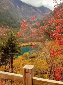 The mountains are draped in golden hues, layers of trees with fiery red maple leaves swaying in the breeze;