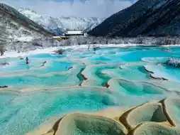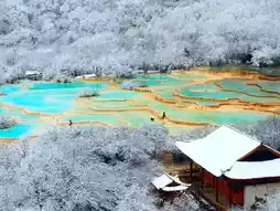 1. Huanglong Five-Colored Pools: Under the winter snow, the colors of the Five-Colored Pools are even more vibrant, and the lake surface resembles emerald snow, creating a stunning photo opportunity.