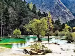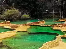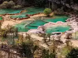 I have to say, October is the most beautiful season in Huanglong! Walking along the colorful pools, this is what I saw: the emerald travertine pools sparkling under the sunlight, surrounded by layers of red leaves. Especially near Huanglong Temple, the red leaves look as dazzling as fiery clouds!