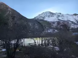 The main attraction is a winding, yellow calcium carbonate formation on the upper part of the mountain, resembling a giant yellow dragon lying in the snow-capped valley.