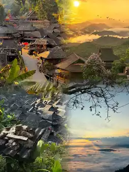 - Morning cloud-sea views over Brown ethnic stilt houses in Wengji Village, learn tea-picking from locals