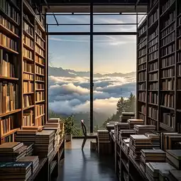 Use bookshelf as foreground to shoot floor-to-ceiling window cloud sea