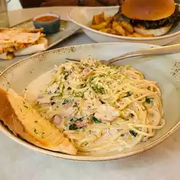 The second section is more cozy with books lined on shelves and cushioned chairs and sofas. We tried the Beef tenderloin burger, Carbonara pasta, a chicken quesadilla and a burn basque cheesecake. Really loved the wedges that came with the burger. Everything was delicious.