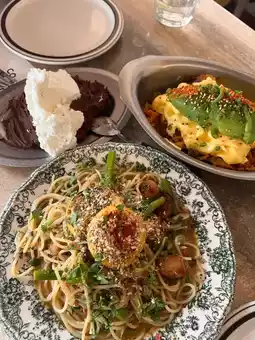 My friend was very excited when she saw the menu and said, "I want to order everything!" In the end, we chose avocado kimchi fried rice (better when it's hot), lemon pasta (a bit oily), and a sweet omelette waffle meat, which I forgot the name of. The chocolate mousse, which is especially popular, has just the right amount of sweetness when eaten with the white part.