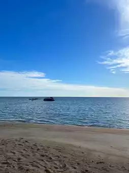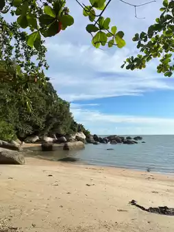 The beach is located next to the village. Walk a little into the village and you will find the beach. There are not many tourists here. Most of the people who go there are locals, so the atmosphere is quite peaceful and not crowded. It is very suitable for sitting and relaxing.