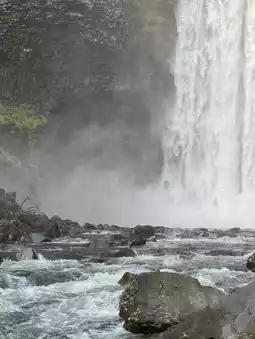 The falls are framed by rugged cliffs, mossy rock walls, and evergreen forests that stretch toward distant mountain ranges. The constant roar of water fills the air, and on sunny days, rainbows often appear in the mist. The combination of wild power and pristine beauty creates a setting both energizing and serene.