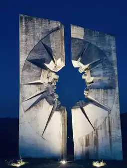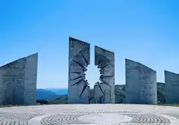 • Symbolism: The most distinctive feature is a 14-meter-high concrete tower with a huge bullet-hole-like opening in the center. The inner wall of the bullet hole has abstract human faces, which symbolize the violence encountered by the soldiers. Its height of 14 meters represents the distance between the Kardinjaca battlefield and the town of Užice. The tilted stones around it symbolize the state of a soldier falling down after being shot.