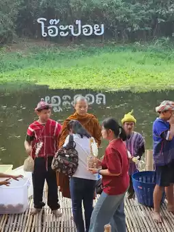 Another highlight that anyone who comes to Oh Poy, Morning Market by the Stream must not miss is to give alms in the morning by the stream. The monks will float on a raft to the Oh Poy Market pier around 7:30-8:00 a.m. to give alms. For anyone who is planning to find a place to travel near Bangkok, I recommend this place. There is everything from food to shopping. You can also make merit.