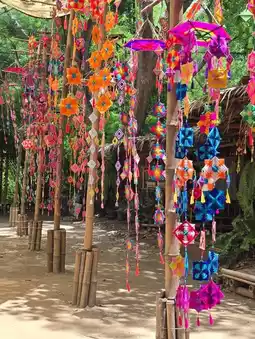 Oh Poi Market, Suan Phueng is a community market located in the middle of nature, on the banks of the Pachi River. The atmosphere is cool and comfortable. The highlight of the market is the many colorful and sized woven mobiles hanging. If you come early in the morning, there will be alms giving. The monks will float down the river on a raft and stop at the market pier.