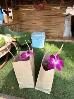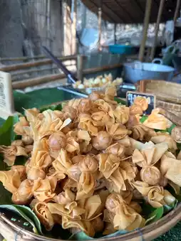 If you visit Suan Phueng and don’t stop by Oh Poi Market, can you really say you’ve been here? Personally, I love this market. Whenever I come to Suan Phueng, I make sure to visit. In the morning, there’s a unique activity where monks float down the stream on rafts for alms-giving. After offering alms, you can explore the market for food and enjoy your meal by the stream. The market provides seating for visitors. They use eco-friendly containers, which is a great touch. My favorite part is the traditional ice cream. The packaging is so well-designed that it’s hard to resist buying more than one, especially for an ice cream lover like me! 🤭🤭