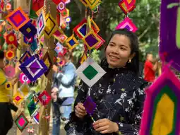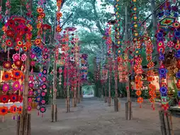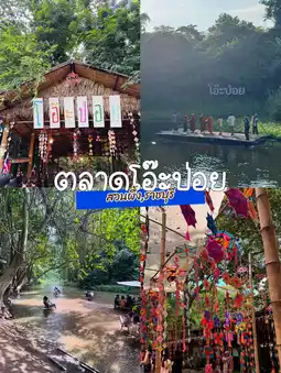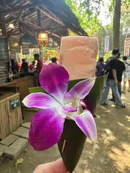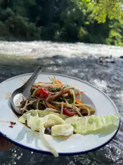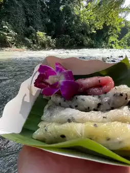 The food containers are biodegradable, with no plastic bags. There's a seating area for eating and relaxing by the stream. The market is shady, with the sound of a flowing stream. The water is crystal clear and cool. In the morning, alms are offered to monks on rafts.
