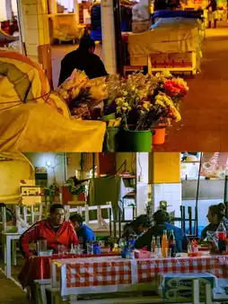 Central Market, a place of trade and daily life. Under dim lighting, gazes intersect, and life unfolds in its routine. Flower vendors sprinkle water on delicate blooms, while food stalls see a constant flow of customers. The shouts and clamor amplify in the vast space, echoing into unnoticed corners.