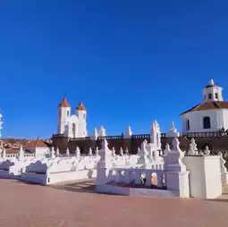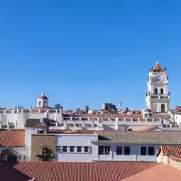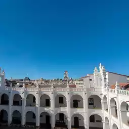 The courtyard and the church are beautiful, but the best thing here is the rooftop. You can actually climb up onto the roof of the church. The roof of the church is not flat, but wavy, and there are several bells. You can see the white city of Sucre, which makes you think you are in Europe. This is the only place in Bolivia where you can see such a view.