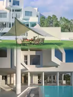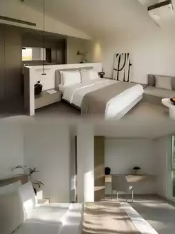 🏠 The building is pure white with minimalist geometric lines, like an off-white tree house hidden in the forest. The exterior is very stylish and complements the surrounding natural scenery, showing its unique charm in the interplay of light and shadow.